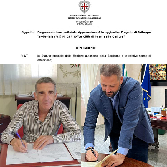 Si rende noto che, relativamente alla sottoscrizione dell’Atto aggiuntivo all’Accordo di Programma Quadro inerente il Progetto di Sviluppo Territoriale "La Città di Paesi della Gallura", firmato in data 17.10.2023, dall’Assessore alla Programmazione, Bilancio, Credito e Assetto del territorio della Regione Sardegna Giuseppe Fasolino, dal Presidente della Provincia di Sassari e dai Presidenti dell'Unione dei Comuni Alta Gallura e Unione dei Comuni Gallura, con Decreto Presidenziale n.54 del 23.10.2023 a firma del Presidente della Giunta Regionale Christian Solinas, si è proceduto all’approvazione del suddetto Atto Aggiuntivo.