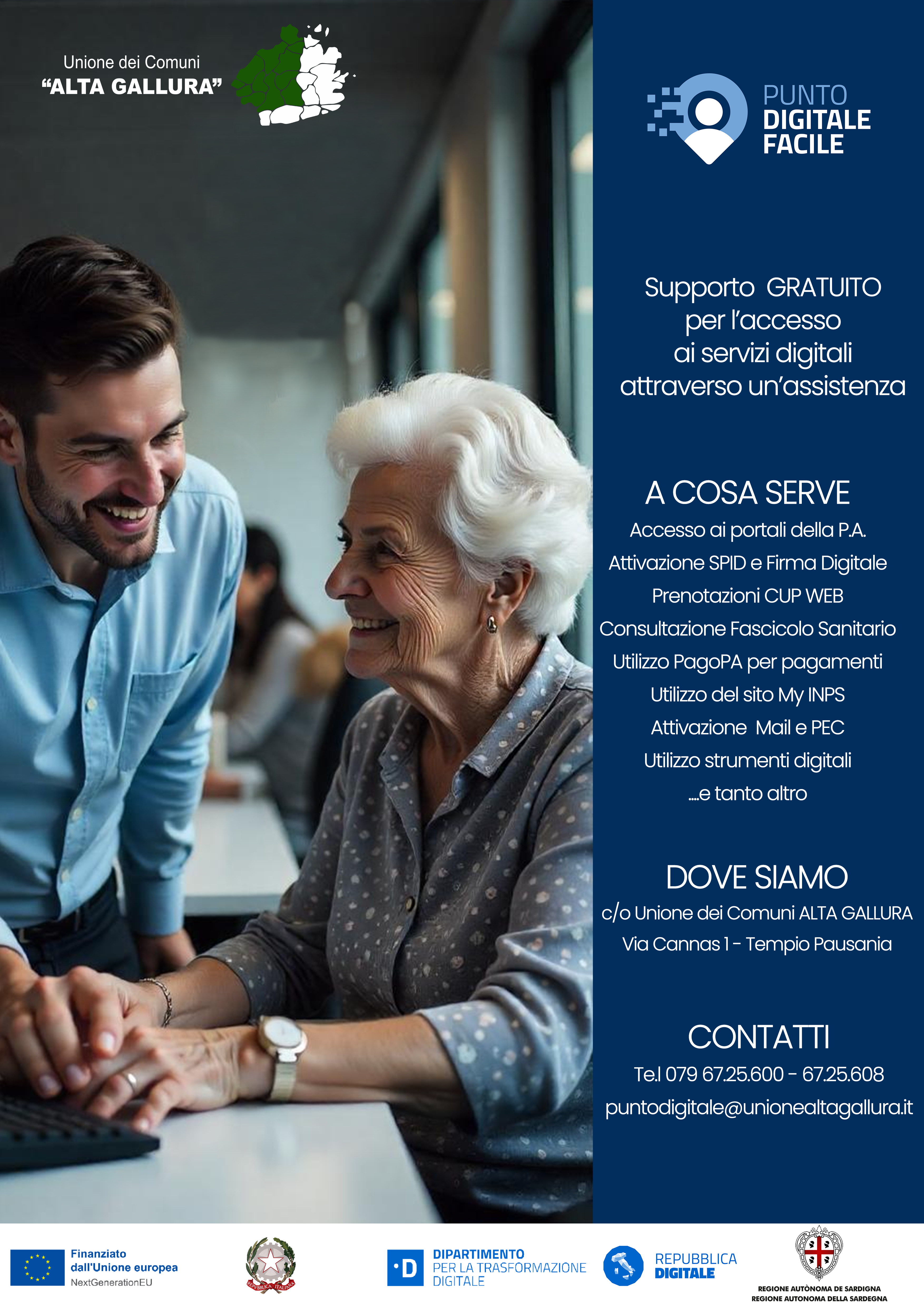 Lo sportello ha sede nei locali dell’Unione dei Comuni “ALTA GALLURA” in via Cannas n.1 a Tempio Pausania, sarà accessibile previo appuntamento contattando i numeri  0796725600 / 0796725608 o scrivendo a puntodigitale@unionealtagallura.it dal lunedì al venerdì negli orari d’ufficio. Presto il servizio diventerà itinerante all’interno dei Comuni aderenti.