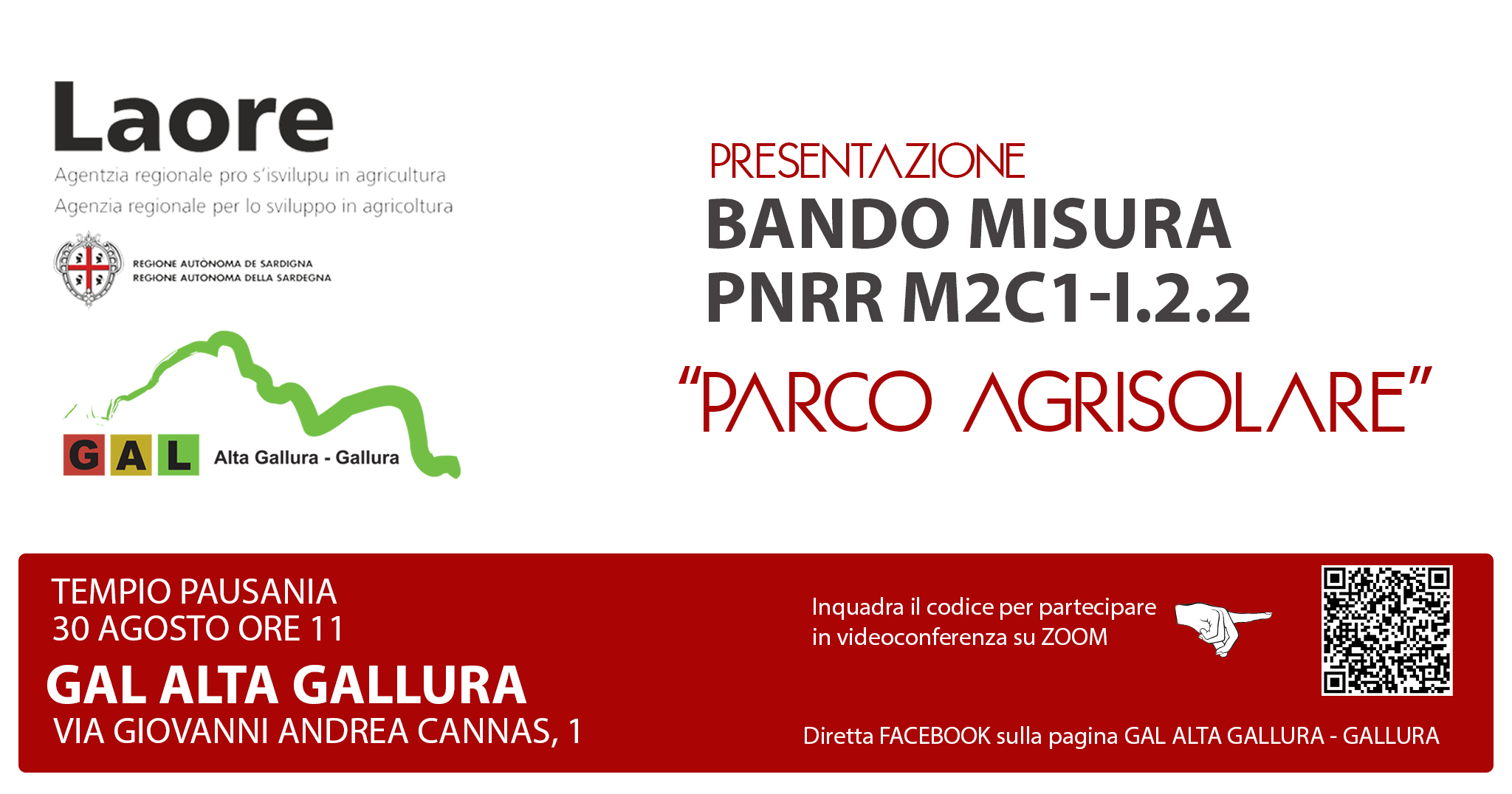 INCONTRO INFORMATIVO SUL BANDO MISURA M2C1-I.2.2 "PARCO AGRISOLARE" MERCOLEDÌ 30 AGOSTO PRESSO SEDE DEL GAL ALTA GALLURA - GALLURA DI VIA CANNAS 1 TEMPIO PAUSANIA